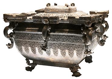The sides of the square outer container, or jian in Chinese, are adorned with coiled dragon patterns, while the lower part is decorated with hanging leaf patterns. Inside the lid is an inscription: “Owned by Zeng Houyi (Marquis Yi) for personal use.”